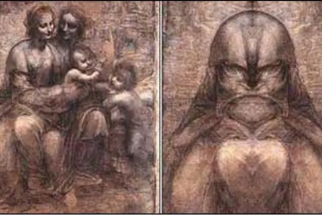 Зашифроване зображення Яхве на картині Леонардо Да Вінчі. Персонажі , яких ми бачимо, це “свята” Анна, Марія, Іоан Хреститель і Ісус. Якщо специфічним чином піднести дзеркало до зображення меншої дитини, Ісуса, то його обличчя перетвориться в лик Яхве.